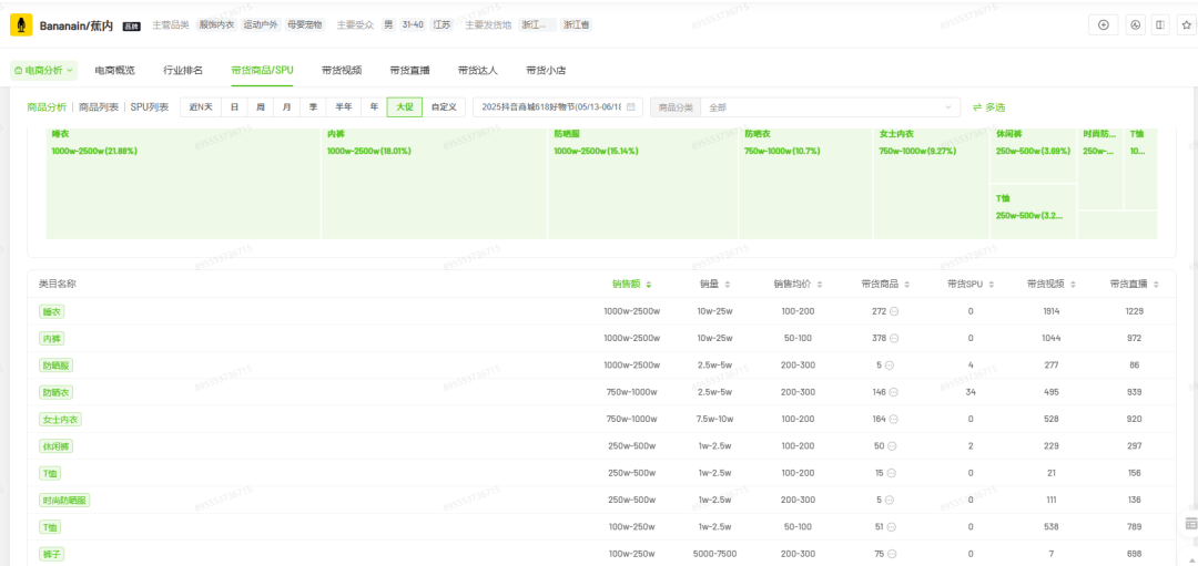 目前来看,蕉内尚未充分证明这种能力。飞瓜数据显示,2025年抖音618期间,蕉内抖音官方旗舰店的销售额仍以睡衣(21.88%)、内裤(18.01%)、防晒服(15.14%)三大品类为主;而短裤、背心销售额仅在25万元-50万元,表现明显偏弱。