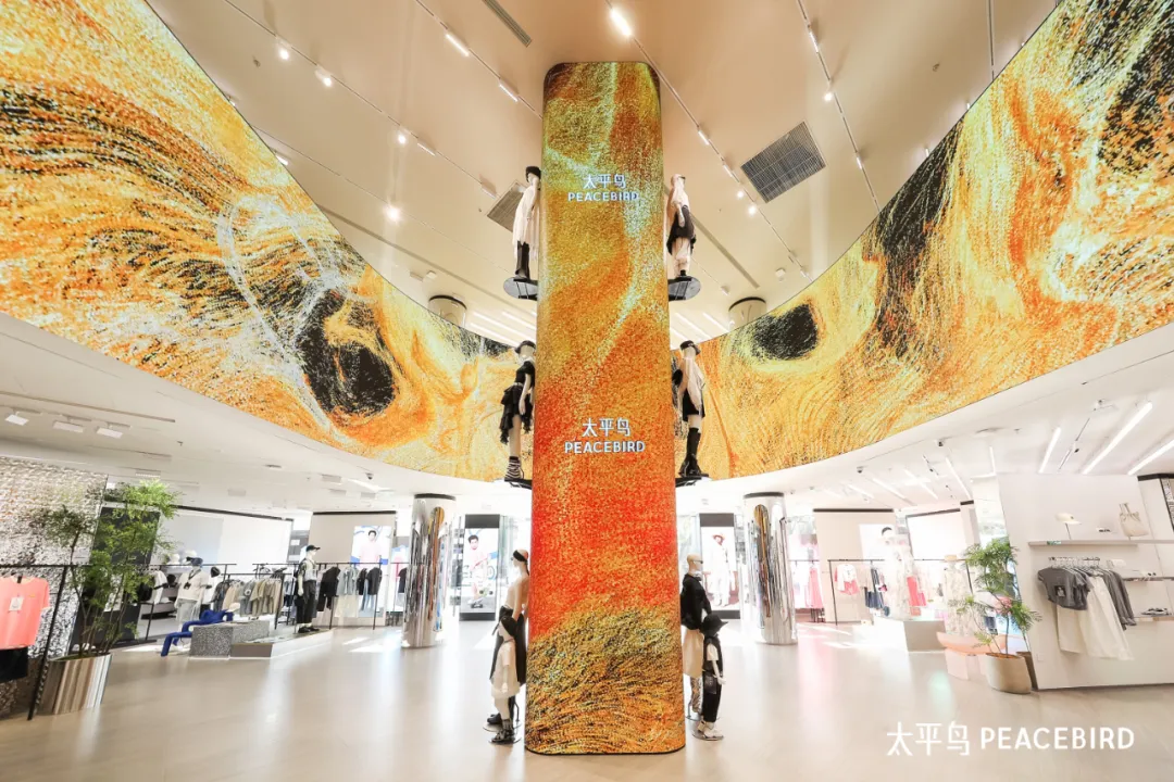为了强化与消费者的情感链接,太平鸟全新旗舰店以“未来聚场”为设计理念,打造了一个全方位的沉浸式体验空间。空间巧妙地将艺术装置与消费体验相融合,将时尚、潮流、闪耀和艺术感等元素交织在一起,不仅展现了旗舰店的时尚嗅觉和先锋姿态,更融入了精品店的高级质感。